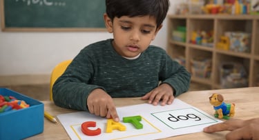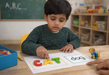 Language becomes a beautiful adventure. Our LKG learners move beyond basics to read and write three-letter words, blend words, and sight words. They become confident in recognizing and writing uppercase and lowercase letters, understanding phonics, and exploring homophones, consonant phonograms, and long/short vowel sounds. They begin reading sentences independently, and enjoy discovering meaning through rhyme, storytelling, and wordplay.