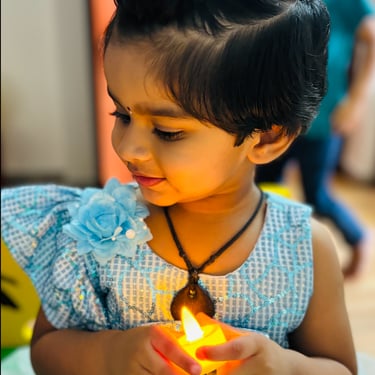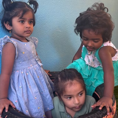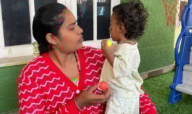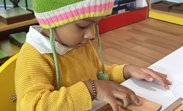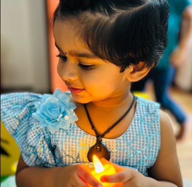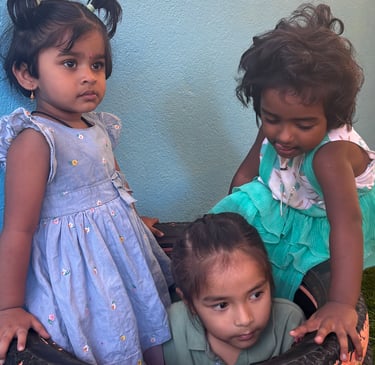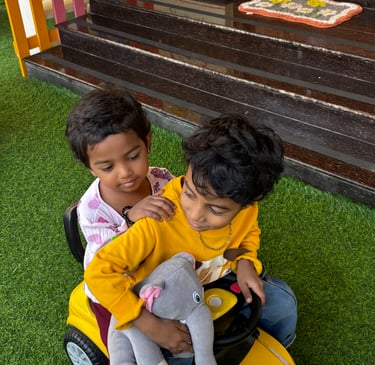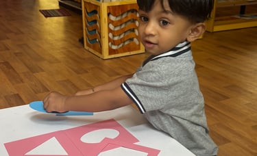 Language blooms naturally in our nursery spaces. Children begin with naming common objects, talking about pictures, and enjoying rhymes and stories. They dive into drawing, art, and tracing curves and lines, helping them prepare for writing. We introduce phonics through sets of letter sounds (starting with c, a, p, t, i, n and progressing through all 26 letters), while gently guiding them to identify beginning, ending, or middle sounds in words. By the end of the year, they can recognize and name A–Z, and begin early reading with joy and confidence.