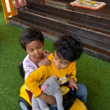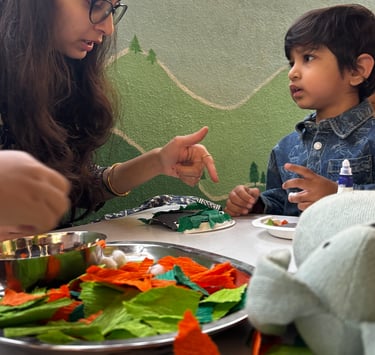 They explore topics like the human body, clothing, safety, food habits, and healthy practices, while learning to recognize emotions and differentiate good vs. bad habits. We guide them through discussions about places, monuments, and city vs. village life, while encouraging awareness of insects, animals, plants, seasons, and trees. They name and sort animals by habitat, vehicles by function, and professions by sector. They even explore topics like emergency and construction vehicles, festivals, musical instruments, dance forms, and cultural dress—all in age-appropriate ways that connect to their real lives.